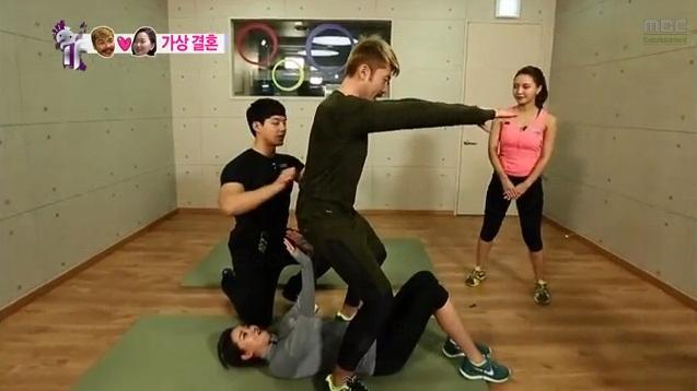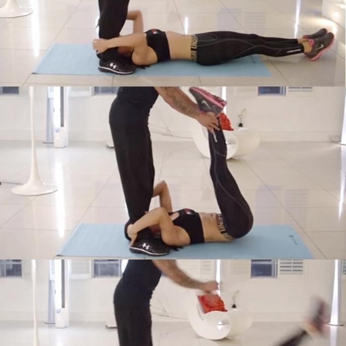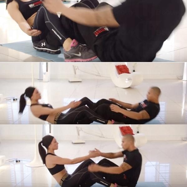 女生與男友的雙腿互相蹺起作固定之效,再用腰部的力量起身,與男友high five,同樣雙手輪流擊掌。這個動作可鍛鍊大腰及小腹肌肉,想減「肚腩仔」的女生留意!