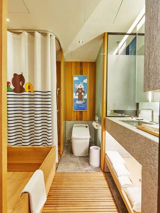 無論是床舗、浴室還是四周的擺設都是LINE FRIENDS,絕對有一種「熊大將我包圍」的感覺。這絕對是各位fans夢寐以求的睡房啊!