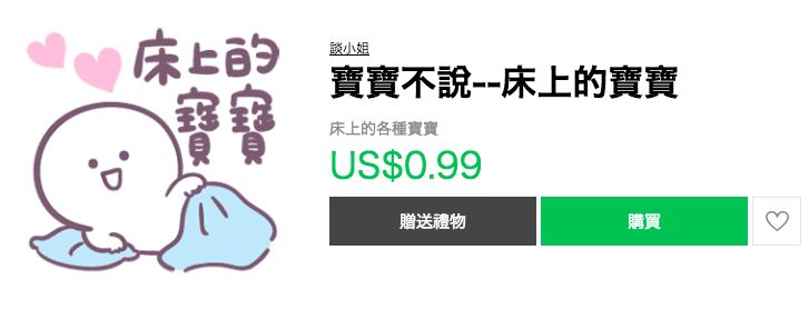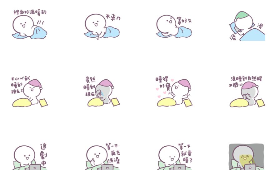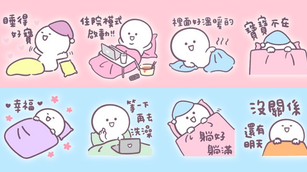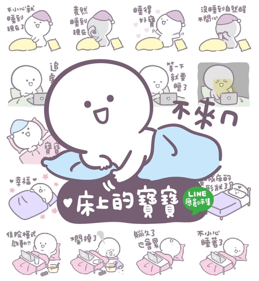 這一系列的貼圖由台灣插畫家談小姐設計,畫中的小角色整天攤在床上,擁有一副呆萌的模樣和矮胖的身型,再加上懶懶的字句,真的超可愛!看著看著,也讓人想像他一樣盡情耍廢呢~