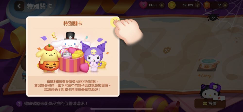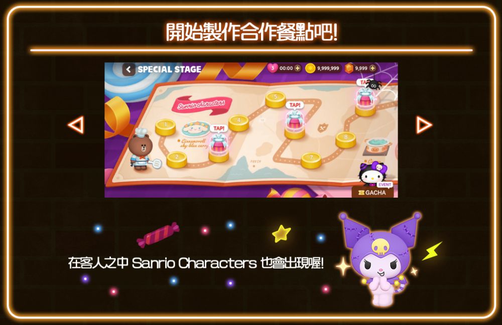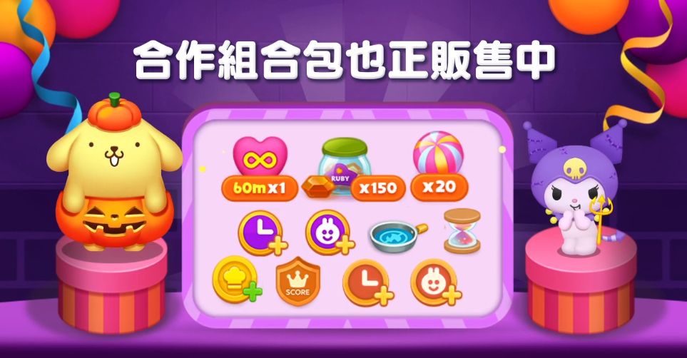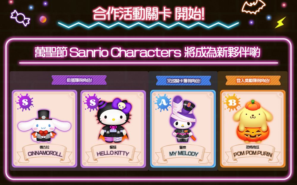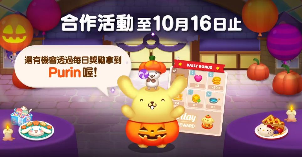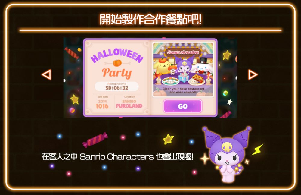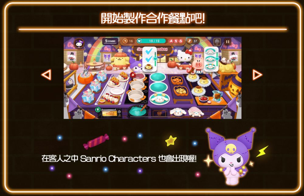 在遊戲的限定合作期間,Hello Kitty、My Melody、玉桂狗和布甸狗將會以超可愛的萬聖節造型出現,裝扮成南瓜、吸血鬼等陪大家一起開心上菜!另外還有穿著萬聖節服裝的Kuromi化身客人出現在特殊活動關卡中,一起來看看詳情吧~