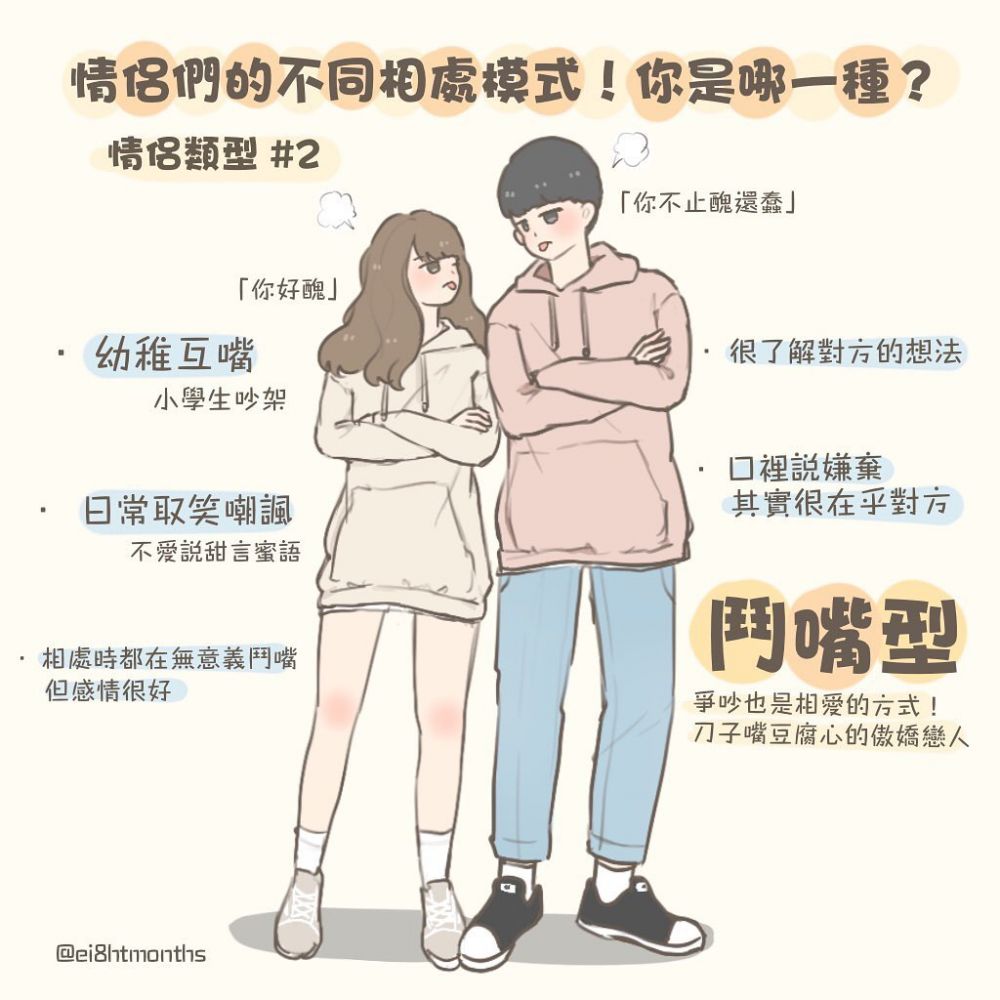 你們一見面便瘋狂鬥嘴,在別人眼中你們就仿佛是小學生談戀愛一樣!像是會揶揄對方又胖又醜,雖然聽起來是攻擊的說話,但對你們而言卻是每天都會說的話!你們這對情侶就仿佛是歡喜冤家一樣,嘴裏說著嫌棄對方的話,但其實比誰都更在乎他!你們也不常會說甜言蜜語,但其實很了解對方,也十分相愛!