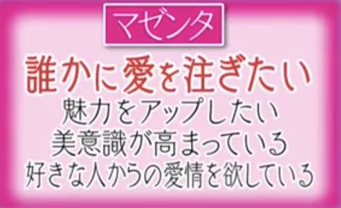 選擇洋紅色的你,代表著你最近特別渴望能將愛意傾注到某個對象身上。這可能是一份深厚的情感,也可能只是單純想對某人好、付出關懷。同時,這也暗示著你正在積極地提升自己的魅力,無論是外在打扮或是內在修養,都希望能讓自己變得更有吸引力。