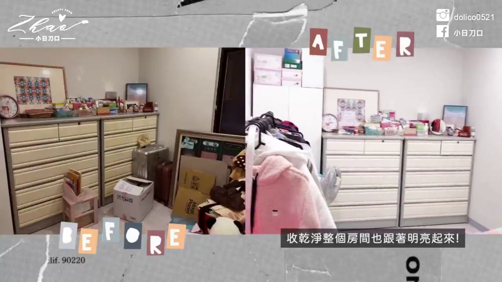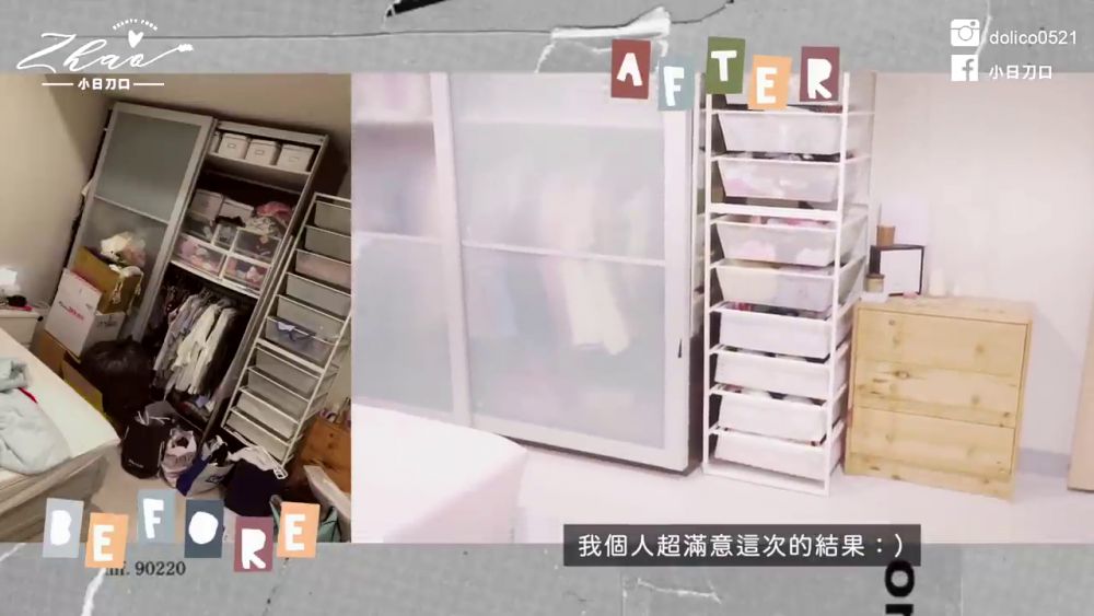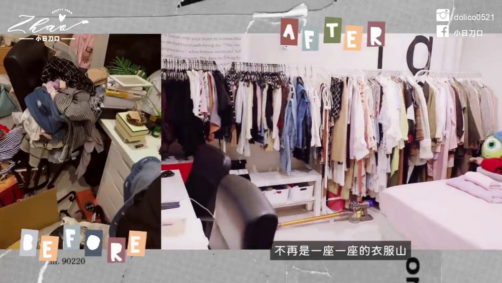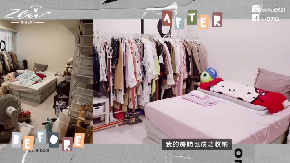 相信女生們每次逛街看到漂亮的衣服,都會忍不住買回家。不過家裡空間有限,東西漸漸地便愈堆愈多。台灣Youtuber @小日刀口家裡被大量衣服及雜物堆滿,除了自己的房間,連飯廳及媽媽的房間都變成「雜物倉庫」!為了改造凌亂的房間,小日刀口分享利用IKEA 收納好物整理所有衣服,前後分別差超多!