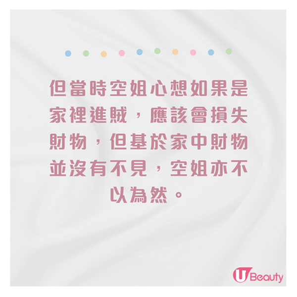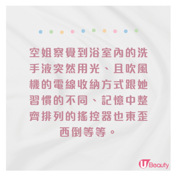 空姐察覺到浴室內的洗手液突然用光、且吹風機的電線收納方式跟她習慣的不同、記憶中整齊排列的搖控器也東歪西倒等等。但當時空姐心想如果是家裡進賊,應該會損失財物,但基於家中財物並沒有不見,空姐亦不以為然。
