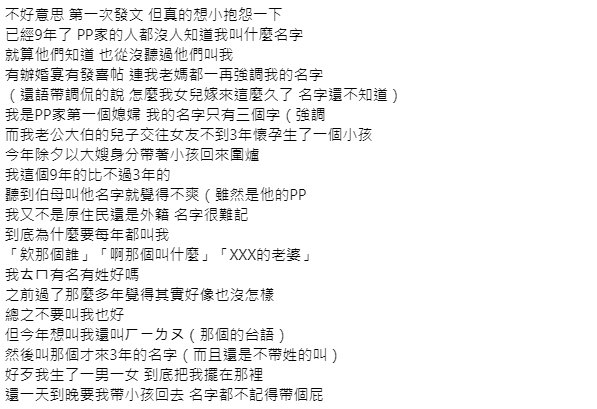 有女網民在Facebook討論區「毒姑九賤婆媳討論區」發文,表示自己結婚九年,與丈夫育有一對兒女。不過,婆家多年來都是以「欸那個誰」、「啊那個叫什麼」、「XXX的老婆」稱呼她,似乎完全不知道她的名字,非常過分。後來,連女事主的母親也看不下去,在婆家面前再三強調她的名字,直言:「怎麼我女兒嫁來這麼久了,名字還不知道」。