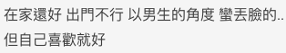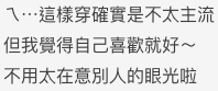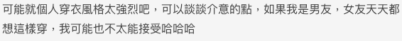 帖文一出隨即引發網民熱議,不少網民都紛紛痛斥男友,認為每人都有「穿衣自由」,作為另一半更應該學會尊重對方的穿搭喜好:「我覺得自己喜歡就好~不用太在意別人的眼光啦」、「假設一個男生連你穿的衣服都看不下去,那他很有可能也無法接受你的個性或其他缺點」、「超級喜歡地雷系但我撐不起來,你一定是很可愛的女生!!!」、「我是很喜歡公主風的衣服,男友倒是不介意」、「哇是地雷系~我也常穿這樣!我覺得很好看呀」。