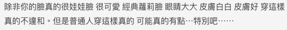 不過,有一部分的網民也認為「公主風」穿搭並非主流,除非個人氣質相符,否則作為日常穿搭實在令人難以接受:「在家還好出門不行,以男生的角度蠻丟臉的」、「如果我是男友,女友天天都想這樣穿,我可能也不太能接受」、「妳如果是胖子或沒到那麼好看可能就不太ok」、「除非你的臉真的很娃娃臉很可愛,但是普通人穿這樣真的可能真的有點特別吧」、「我感覺風格強烈的衣服很看臉,要化妝才撐得起來」。