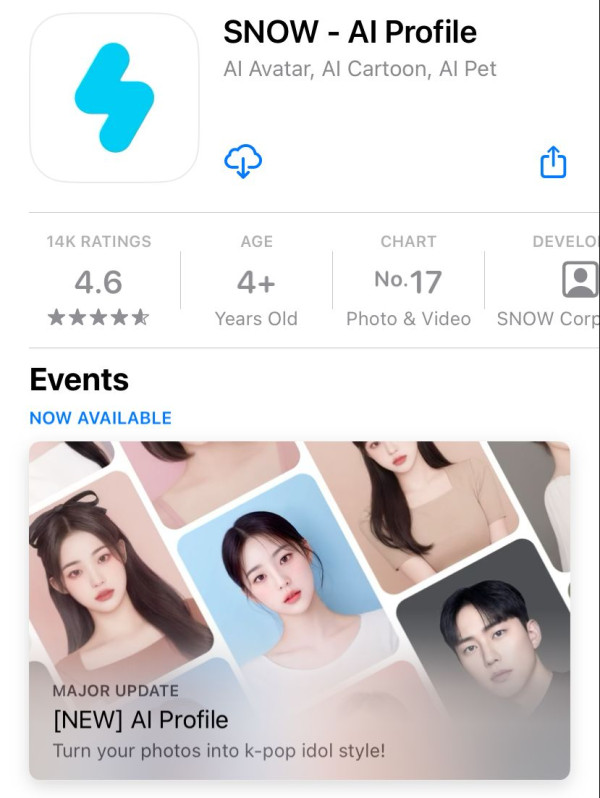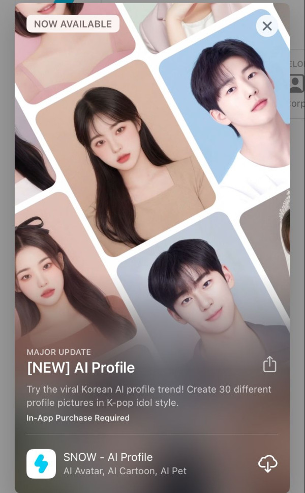 「AI Profile」是由韓國美顏拍攝應用程式「Snow」推出的新軟件,最近登上了照片和影片相關程式熱門排行榜的第二名!用戶下載後點選「AI Profile」功能,就可以跟著簡單的步驟上傳20張自拍照,讓AI運算製作出你的大頭照。過程中結合了AI換臉技術和AI繪圖生成技術。