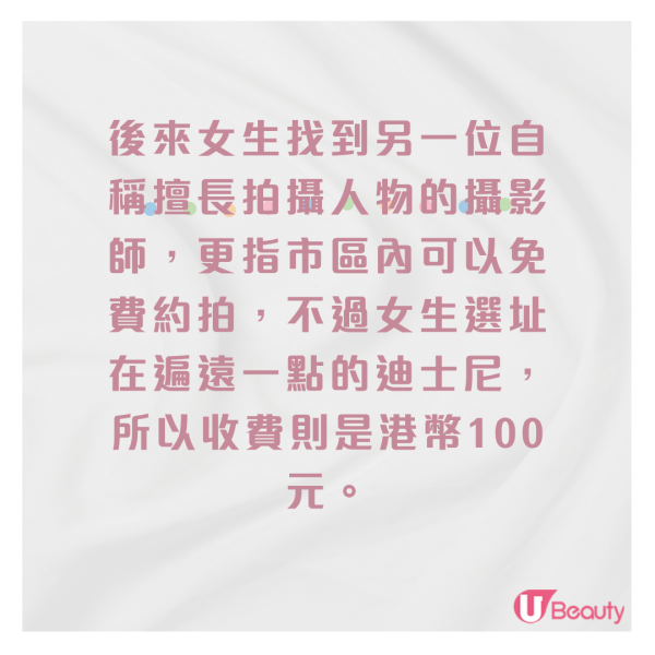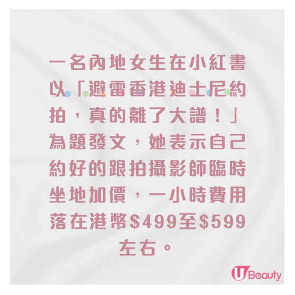 一名內地女生在小紅書以「避雷香港迪士尼約拍,真的離了大譜!」為題發文,她表示自己約好的跟拍攝影師臨時坐地加價,一小時費用落在港幣$499至$599左右,後來女生找到另一位自稱擅長拍攝人物的攝影師,更指市區內可以免費約拍,不過女生選址在遍遠一點的迪士尼,所以收費則是港幣100元。
