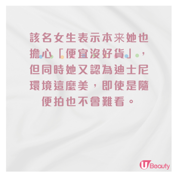 該名女生表示本来她也擔心「便宜沒好貨」,但同時她又認為迪士尼環境這麼美,即使是隨便拍也不會難看。女生向攝影師展示了幾張範例圖片,包括城堡正面大全景,櫉窗全景等,而攝影師亦有回覆「沒問題」,想不到這竟是惡夢的開端。