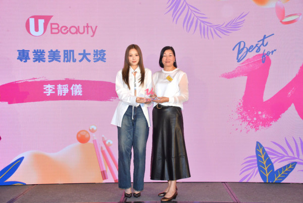 由Ms. Vivienne Wong, Executive Director and Company Secretary of HKET Holdings Ltd頒發「U Beauty專業美肌大獎」予王君馨及Heidi李靜儀。