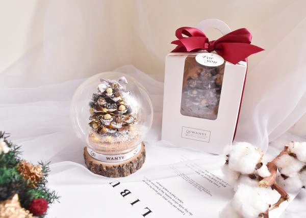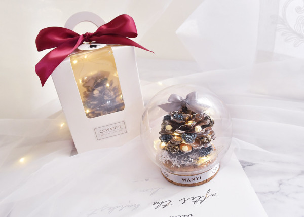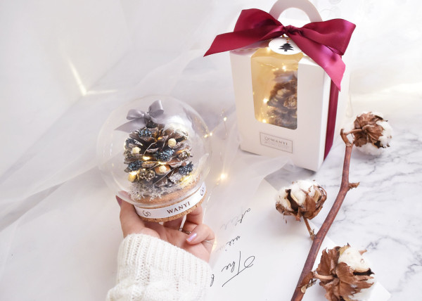 台灣花藝品牌推出聖誕版的魔法球小夜燈。魔法玻璃罩裡面有可愛的松果,而且非常耐放,在玻璃罩裡面不怕染上灰塵,可以陪男朋友度過好多個冬天。底座還可以客製雷射雕刻字,可以刻上男朋友或是自己的名字後,同居情侶放置可愛聖誕擺件可以增添節日氛圍,亦是交換聖誕禮物之選!