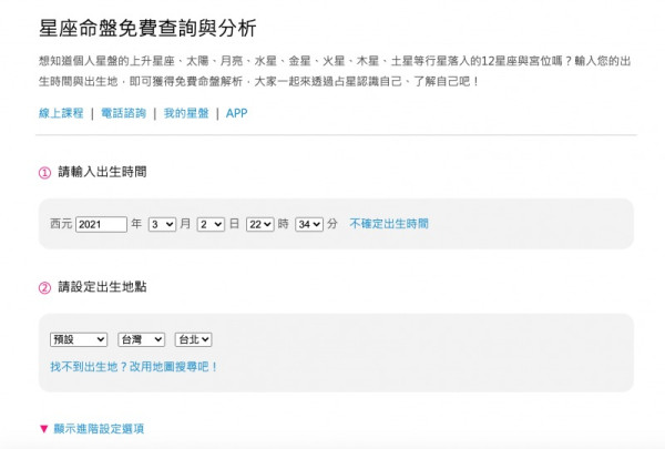 首先登入「占星之門」,要先確定好自己的出生年月日、時間以及出生地,才能精準算出自己的星座命盤。