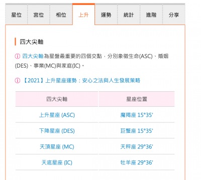 在這張分析圖中,我們會看到上升、下降、天頂以及天底星座,這四個交點象徵生命、婚姻、事業以及家庭,這邊教各位簡單判讀四大尖軸的意義: