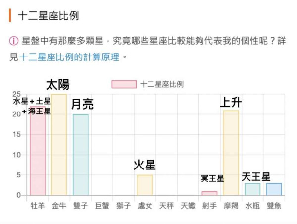 集結以上第2、3點的星座小知識,就可以來探討大家最好奇的十二星座比例圖了,我們可以清楚看到哪些星座占我們個性中最大的一部分、這邊會清楚反映一個人完整的個性組成,以上面的例子來說,這個人雖然太陽星座是金牛座,但月亮雙子座的比例也非常高,可能他的個性就不會是你既定印象中金牛座的慢條斯理,會有更多雙子座的幽默風趣。
