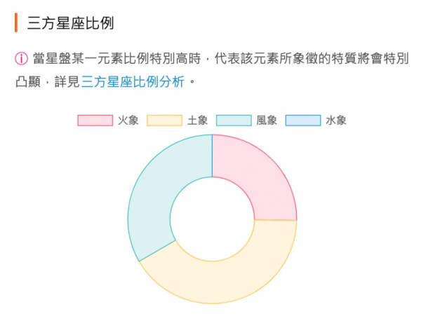 計算出星座比例後,下方的「三方星座比例」能讓你快速判讀你的人格組成,先幫大家科普一下風象、土象、水象、火象星座所代表的個性。