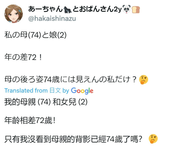 最近在日本twitter有網友分享了一張相,相中可見一對看似母女在互相牽著手散步,兩人背影纖細,長髮飄飄。不過文主則表示照片中的人是他的母親和女兒,母親今年74歲,女兒才2歲,原來是和孩子相差72歲的外祖母。許多網友表示「照片中的母親看起來一點都不像74歲,背影纖細,長髮飄飄,就像是一位年輕的媽媽」。有人甚至指「如果不知道年齡,還以為是母女!」。所以這張照片證明了年齡不是衡量一個人年輕與否的唯一標準,只要保養得宜,即使是70多歲的老人,也可以擁有年輕的體態和容貌。