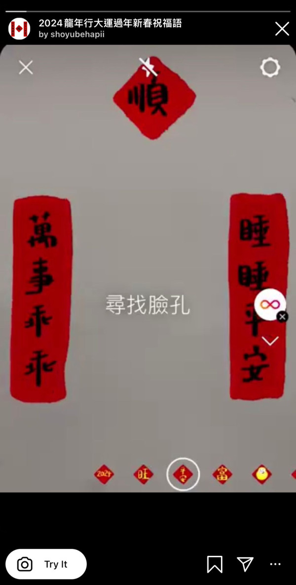 這款Filter提供多款祝福語背景,例如「睡睡平安」、「好運龍來」,還可追蹤人臉配上「龍光煥發」、「2024」等字眼,非常萬用值得收藏!