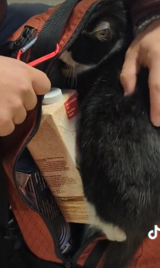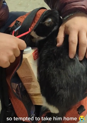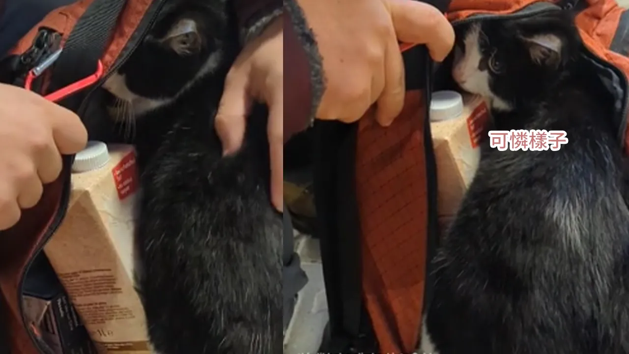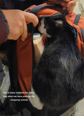 這對夫婦Kate Hoare與丈夫Seb去年在保加利亞城市Bansko一家雜貨店購物時,正準備買得的日用品放進背包中,突然間一隻流浪貓毫無預警地衝進他們的背包裡,並且不願離開。當時,這隻小貓的行為令夫婦二人感到非常奇怪,直到附近傳來一陣凶狠的狗吠聲,他們才意識到這隻小貓其實是在向他們求救。小貓看起來十分驚恐,拼命鑽進幾乎已經滿滿的背包裡,似乎認為這裡是最安全的避風港。
