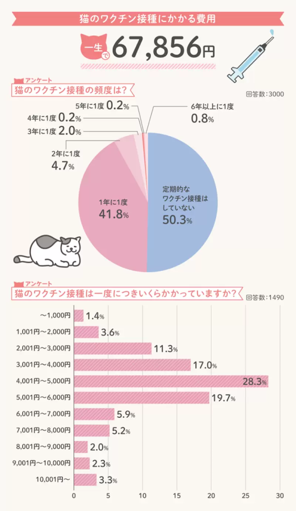 至於「臨時開銷」中,相信就是「貓奴」最頭痛的一環,因為醫療費用項目,雖然有一半受訪者都會為愛貓定期施打的疫苗、健康檢查,以貓的一生可能會罹患的疾病,平均可能會花費2萬元(港幣)!