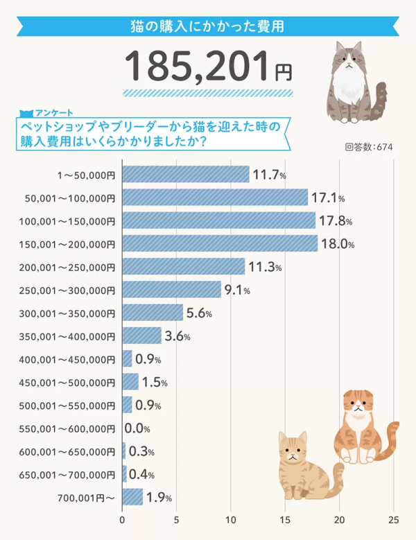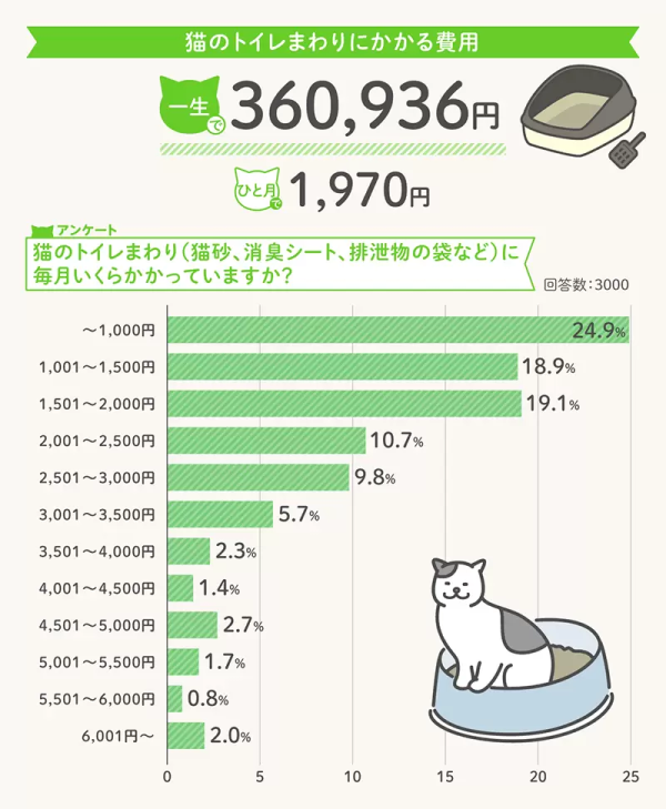 據知,日本保險公司根據日本寵物協會的調查中得知寵物貓平均壽命15.62歲,並講花費分為「最初費用」(購買、結紮、用品等)、「日常開銷」(消耗品、貓砂、飲食等)、「臨時開銷」(身體檢查、疫苗、看病、空調等)等三大項。