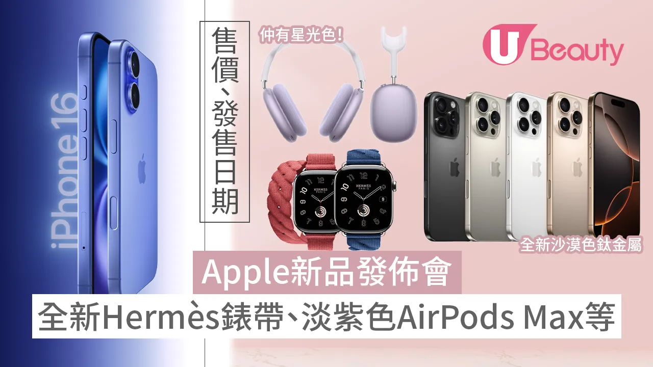 Apple 舉行年度最重要的秋季發佈會,今次新推出紫藍色調的 iPhone 16、iPhone 16 Pro 系列則新增了顯白的沙漠色、超美淡紫色 AirPods Max、Hermès 更首度為 Apple Watch 推出金屬錶帶, 女生買前必看!