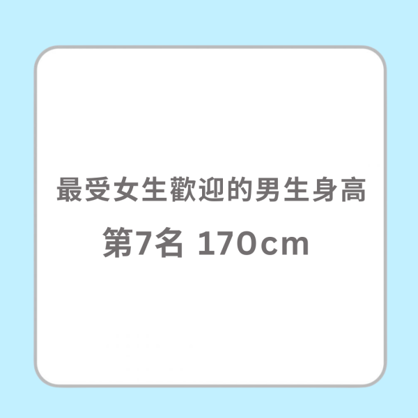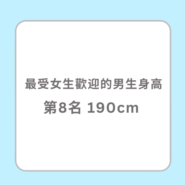 男生身高原來不是愈高愈受女生歡迎!如果另一半太高似乎走在一起也有壓力,難怪190cm只排第8。而 178cm 及180cm分別排第1及2位,因為亞洲女生身高一般都不算很高,所以另一半的身高是178-180cm便感覺很有安全感!