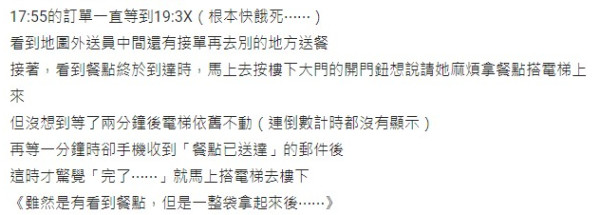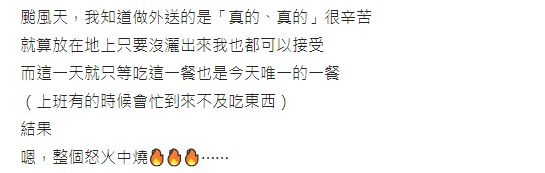 事主發長文表示:「颱風天我知道做外送的是真的真的很辛苦,就算放在地上只要沒灑出來我也都可以接受」解釋自己是因為工作的關係太忙碌所以整天就只能夠外賣吃一餐,說等訂單已經等了超過一個半鐘頭。「看到餐點終於到達時,馬上去按樓下大門的開門鈕想說請她麻煩拿餐點搭電梯上來,但沒想到等了兩分鐘後電梯依舊不動,再等一分鐘時卻手機收到餐點送達的郵件後,這時才驚覺完了⋯就馬上搭電梯去樓下」沒想到就看到以上的崩潰畫面!