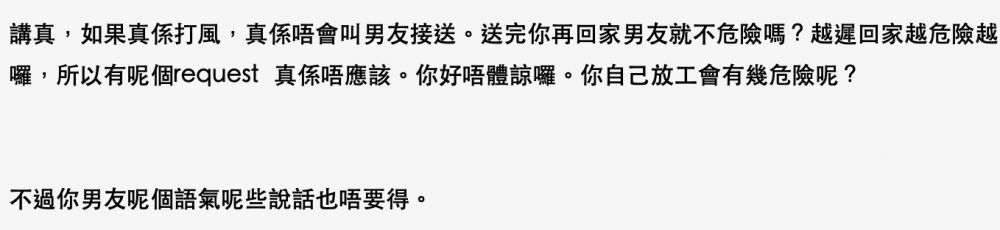 男朋友最後更開玩笑說「放心啦,冇咁易吹得走你㗎喎!就算吹走你我都驚你整親其他人」,補上最後一刀。女網友補充以前男朋友寧願走路也要多見一會,現在卻連接放工這些小事也諸多藉口推搪,認為男朋友「真係變咗」。