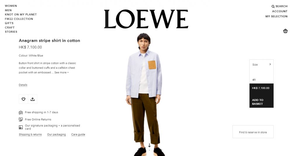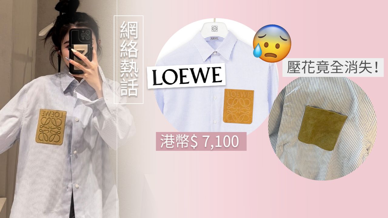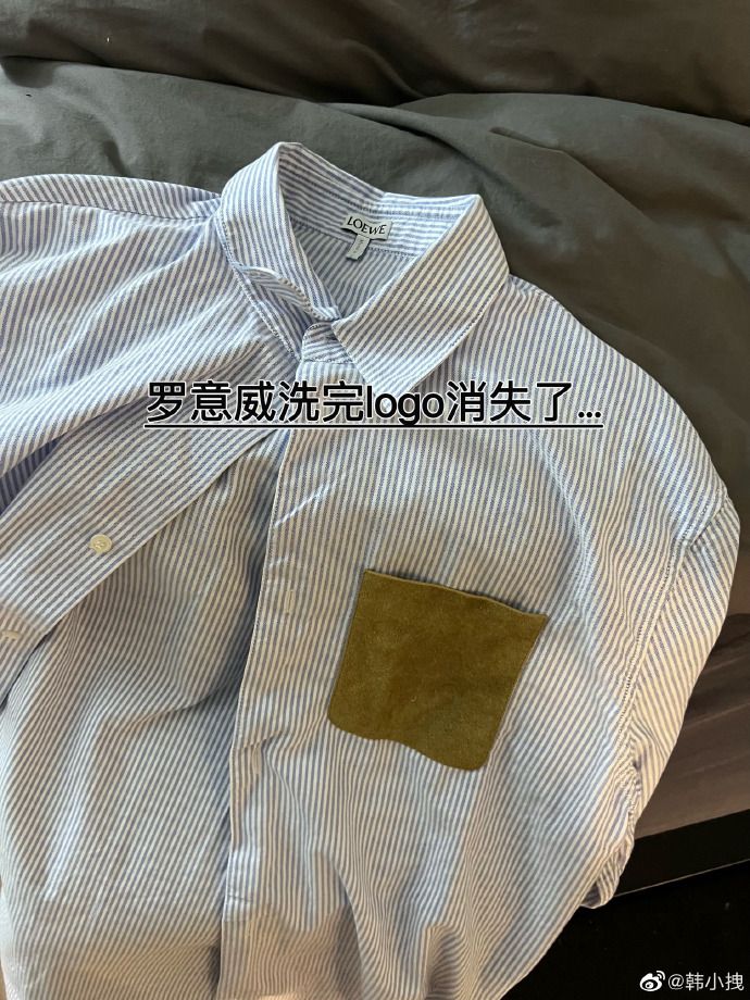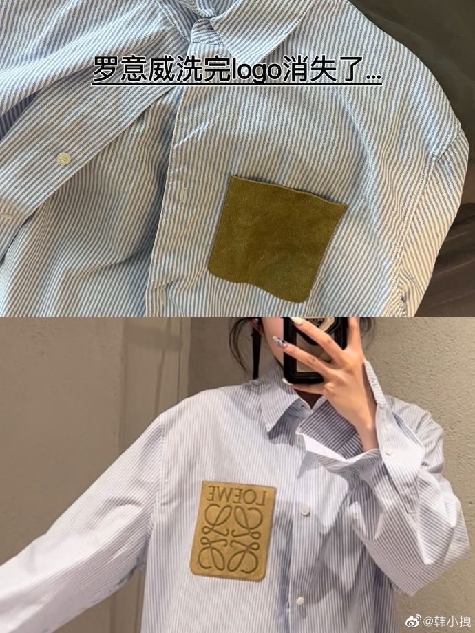 這位女網紅購買的名牌襯衫來自品牌LOEWE,一件男裝的棉質條紋襯衫,價值港幣$ 7,100,白色藍色條紋設計,小牛皮胸袋飾有 LOEWE Anagram 壓花,意大利製造。網紅崩潰分享襯衫洗一次後LOGO竟然消失了,立即拍下照片於網上訴苦↓↓