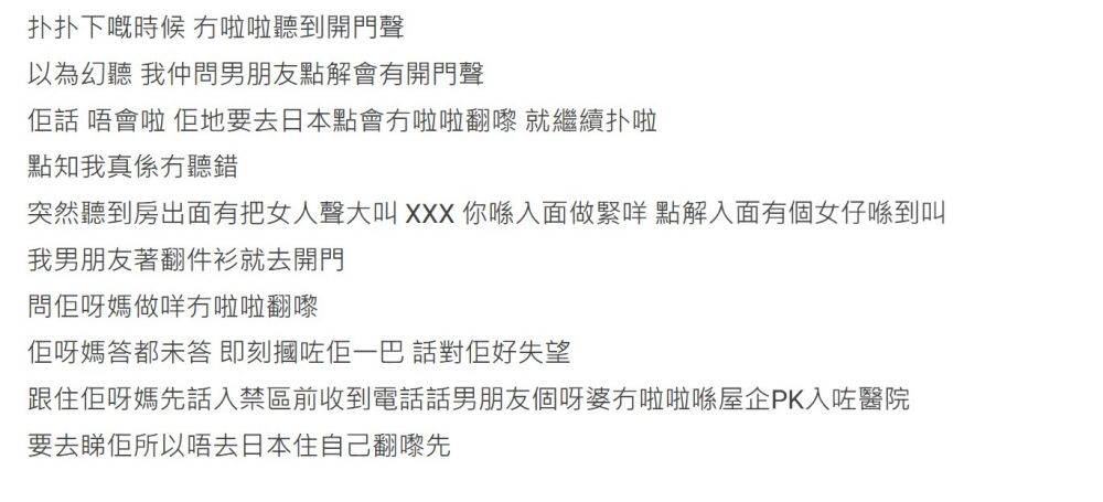 就在這個時候,門外突然出現一把女聲,憤怒斥責男方「喺入面做緊咩」,還質問他為何「有個女仔喺到叫」;樓主男友馬上穿好衣服應門,竟發現家母站在門外!