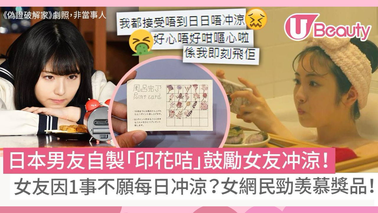 男友為了鼓勵她突破心理障礙,克服每天沖涼的恐懼,特意為她自製一張專屬的「印花咭」,咭上更清楚列明只要在晚上7點前沖涼便可獲印花一個!集齊50分就可以收到化妝品作爲禮物。印花咭除了設計精美,男友還細心選用充滿少女心的花花貼紙作為「印仔」。這個窩心舉動令女友每天充滿動力沖涼,更表示目前已經積攢了許多張儲滿印花的印花咭。