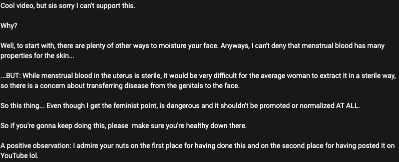 影片引起熱烈討論,不少網民看過影片後都表示震驚,認為該名美妝YouTuber的這個行爲極度噁心:「月經是無菌的,但不代表能夠塗在臉上」、「我無法支持這個」、「如果觸摸到自己的經血,我已經想嘔吐」、「行爲怪異」、「希望影片是假的」。不過,另有網民看到驚人成果後躍躍欲試:「看來比大多數護膚品更好用,還是免費的」、「您的影片給了我動力,我都想嘗試下」、「我用過,真的很有效!」、「我也試了,它極大地幫助了我的荷爾蒙痤瘡」。