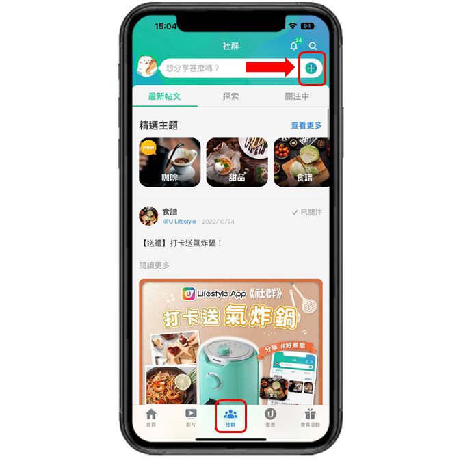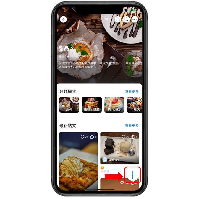 第二步:於《社群》主頁或 進入主題按「+」(加號),即可開始您的分享!