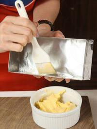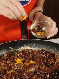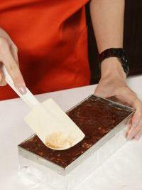 | (7) 加入核桃碎 | (8) 加入預先磨好的橙皮蓉,將材料混合好。 | (9) 在焗盤內掃上一層牛油。 |