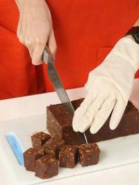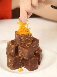 | (10) 將混合物放入焗盤,壓實;放入雪櫃冰鮮層雪至凝固。 | (11) 把軟糖倒出,切成正方粒。 | (12) 最後灑上少許橙皮絲,大功告成。 |