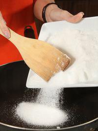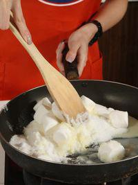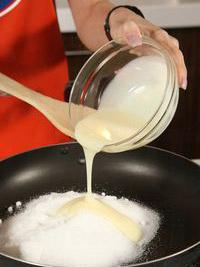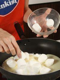 | (1) 將砂糖倒到底鍋中。 | (2) 加入煉奶和棉花糖。 | (3) 用慢火煮 6 分鐘。 |