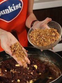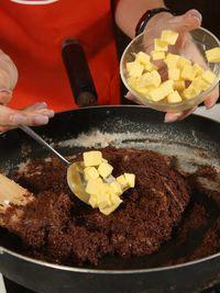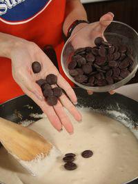 | (4) 不停攪拌混合物至糖完全溶化,成一漿狀物,然後將平底鍋離火。 | (5) 加入朱古力片。 | (6) 加入預先切成粒狀的牛油粒。 |