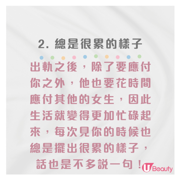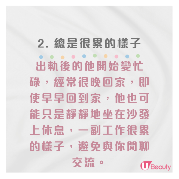 出軌之後,除了要應付你之外,他也要花時間應付其他的女生,因此生活就變得更加忙碌起來,每次見你的時候也總是擺出一副很累的樣子,話也是不多說一句!出軌後的他開始變忙碌,經常很晚回家,即使早早回到家,他也可能只是靜靜地坐在沙發上休息,一副工作很累的樣子,避免與你閒聊交流。