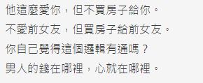 女事主自認不甘心,甚至不忿「憑什麼對方分手就可以拿到那些」,甚至表示自己願意一起分擔房貸,男友也不願意買房。雖然,事後男友嘗試跟媽媽建議「不要這麼強勢」,結果自認為個性很好的媽媽,當場拍桌怒吼然後摔門離家出走。網民看後表示反轉又反轉的結局令人意外,不少人甚至留言冷嘲熱諷女事主「你想被哄騙誰都勸不了你」,有網民更寫出警世語錄點醒事主,表示「愛在哪,錢在哪,適用所有關係,親子、男女 這就是真理。」