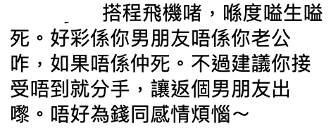 而女網友則表示來回日本大約需要8-9小時,而自己認為一同乘搭飛機同樣是旅遊的一部分,故此接受不了男友為了節省旅費而要求分開前往日本,亦因為選擇上網詢問網民的看法。