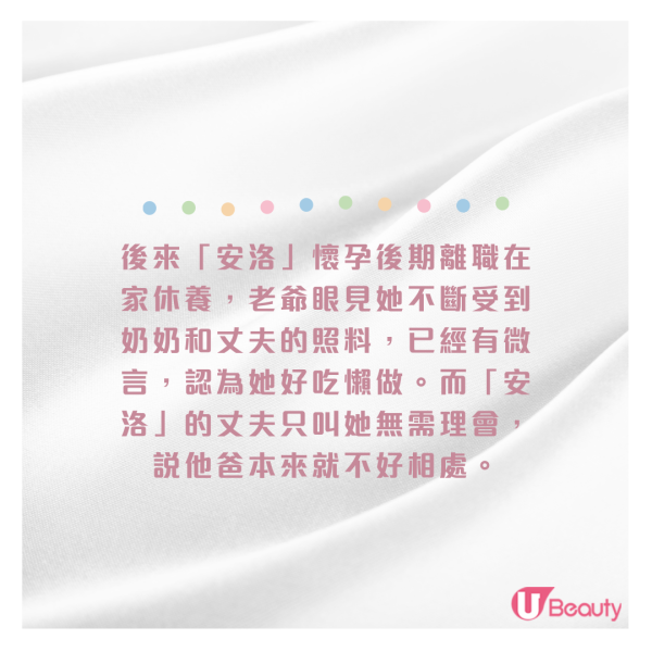 後來「安洛」懷孕後期離職在家休養,老爺眼見她不斷受到奶奶和丈夫的照料,已經有微言,認為她好吃懶做。而「安洛」的丈夫只叫她無需理會,說他爸本來就不好相處。