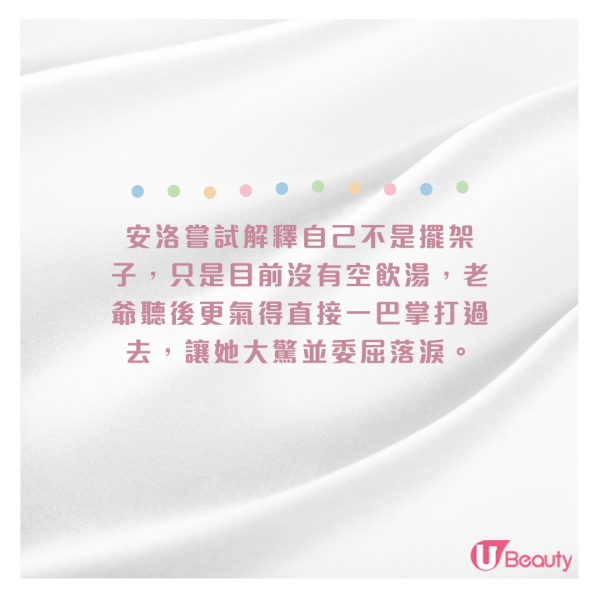 後來「安洛」在家坐月,老爺剛好代替奶奶送湯,正在哄寶寶睡覺的「安洛」分身不暇,請老爺把湯先放在枱上她一會兒再飲,老爺馬上發火直斥她「架子大得很」!安洛嘗試解釋自己不是擺架子,只是目前沒有空飲湯,老爺聽後更氣得直接一巴掌打過去,讓她大驚並委屈落淚。