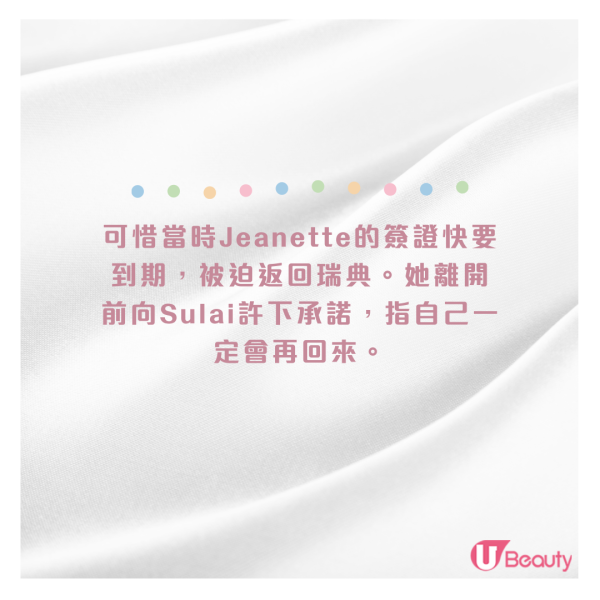 在Jeanette旅行期間,Sulai一直陪伴在她身邊,即使語言不通,但這並未阻礙他們之間的交流。他們一起遊覽了整個PP島,七個月就這樣不知不覺地過去。可惜當時Jeanette的簽證快要到期,被迫返回瑞典。她離開前向Sulai許下承諾,指自己一定會再回來。