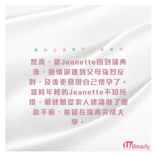 然而,當Jeanette回到瑞典後,戀情卻遭到父母強烈反對,及後更發現自己懷孕了。當時年輕的Jeanette不知所措,最終聽從家人建議做了墮胎手術,並留在瑞典完成大學。畢業後她成為了一名建築工程師,組織了自己的家庭,並生了兩個可愛的孩子。