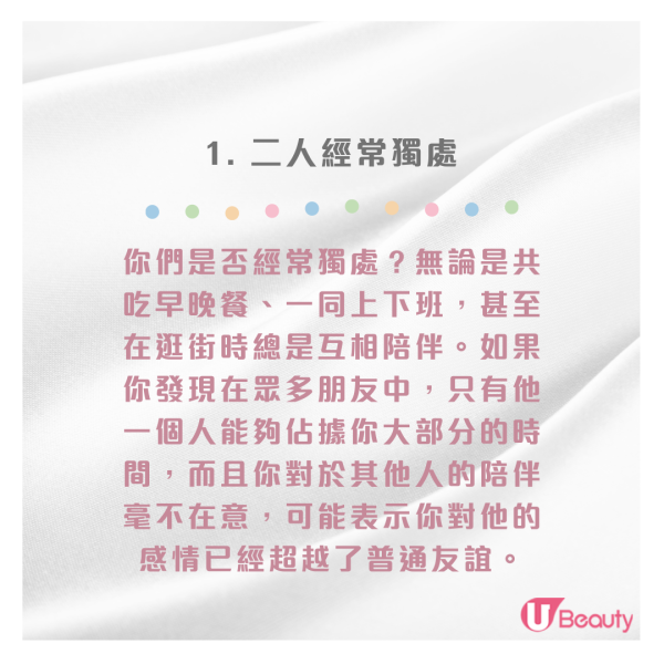 你們是否經常獨處?無論是共吃早晚餐、一同上下班,甚至在逛街時總是互相陪伴。如果你發現在眾多朋友中,只有他一個人能夠佔據你大部分的時間,而且你對於其他人的陪伴毫不在意,那麼這可能是一個迹象,表示你對他的感情已經超越了普通友誼。