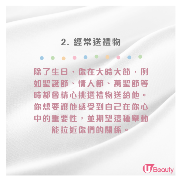 除了生日,你在大時大節,例如聖誕節、情人節、萬聖節等時都會精心挑選禮物送給他。你想要讓他感受到自己在你心中的重要性,並期望這種舉動能拉近你們的關係。