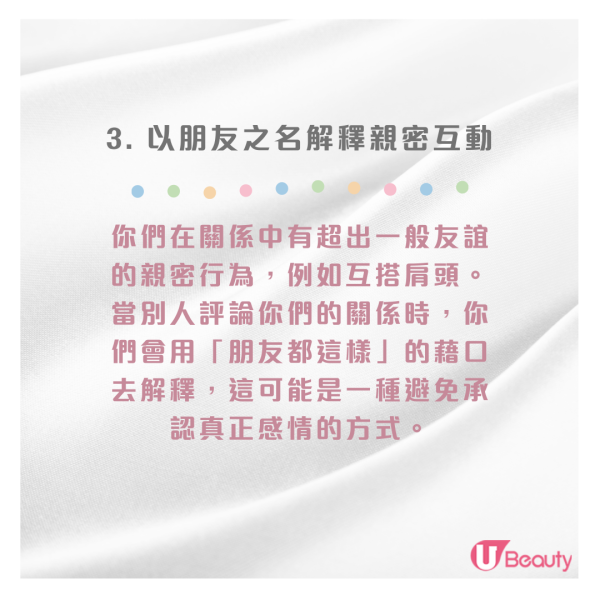 你們在關係中有超出一般友誼的親密行為,例如互搭肩頭。當別人評論你們的關係時,你們會用「朋友都這樣」的藉口去解釋,這可能是一種避免承認真正感情的方式。