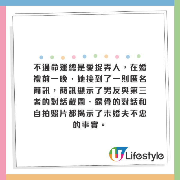 婚前一刻才發現另一半出軌,你會怎麼做?外國一名女生Casey一直以為她找到了一個可以共度餘生的伴侶,然而在婚禮前一天,她收到了一封匿名簡訊,命運從此就改變了。
