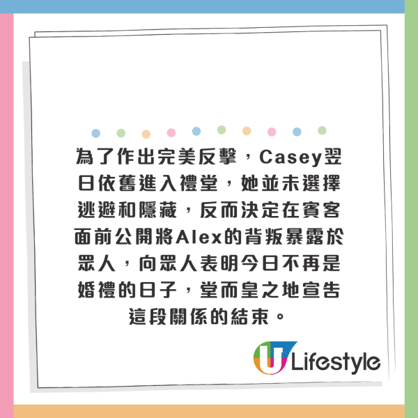 為了作出完美反擊,Casey翌日依舊進入禮堂,她並未選擇逃避和隱藏,反而決定在賓客面前公開將Alex的背叛暴露於眾人,向眾人表明今日不再是婚禮的日子,堂而皇之地宣告這段關係的結束。最終Alex無法面對這一切,默默離開了現場。Casey的勇敢舉動得到了所有賓客的支持和鼓勵,現場立即響起了大量掌聲和歡呼聲。Casey以她的勇氣面對和接受真相,這才是真正的勝利。